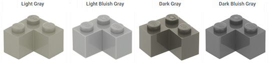 vier Farbtöne von grauen LEGO Steinen. Die alten Farben sind Hellgrau und Dunkelgrau (mit leichtem Rotton-Stich). Diese wurden jedoch durch bläulich-graue Hellgrau- und Dunkelgrausteine ersetzt.